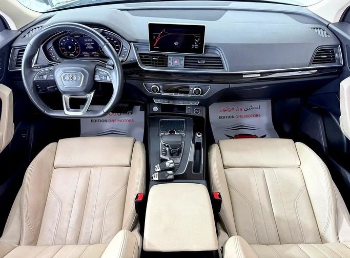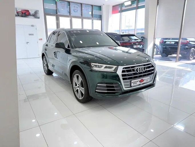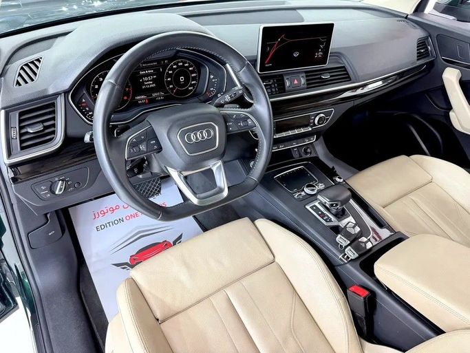 The 2019 Audi Q5 II (FY) is a five-door green-colored SUV that features a powerful 2.0-liter TFSI engine, producing 252 horsepower. It is equipped with an all-wheel drive system (quattro) and an automatic manual transmission (AMT). This vehicle has had only one owner since new and currently shows approximately 108,000 kilometers on its odometer, adhering to Gulf Cooperation Council (GCC) specifications. The combination of these components offers confident acceleration and stable road manners, blending dynamics and comfort for everyday use. Inside, practicality is evident t