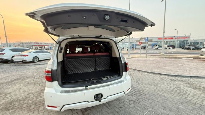 The 2022 Nissan Patrol VI (Y62) Facelift 2 is a used, five-door SUV in white that pairs a muscular 5.6-liter gasoline V8 with an automatic transmission and all-wheel drive. Delivering 400 hp, it offers strong on-road performance while maintaining capable off-road ability, supported by the robust Patrol platform and AWD dynamics. This GCC-spec model is well suited to regional conditions and comes from a single previous owner, with 110,000 kilometers on the odometer. Inside, the Patrol emphasizes a comfortable, practical cabin designed for longer journeys, balancing refined p