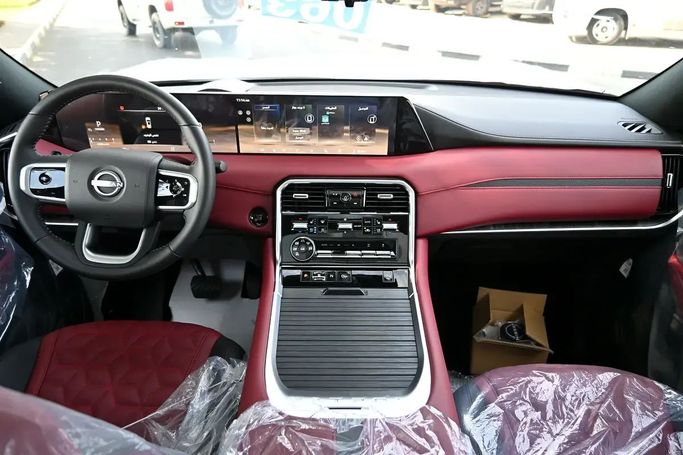 Nissan Patrol LE Titanium+ - 2025 Engine and performance 3.5 liter V6 twin-turbo with direct injection system. Power is about *425 hp and torque *700 Nm. Transmission * * 9-speed automatic * with permanent all-wheel drive. Powerful on-road and off-road performance thanks to Traction Management Systems and various driving modes. Amenities and facilities A luxurious cabin in high-quality leather with heated and cooled front seats. Large touch screen + advanced infotainment system, rear passenger entertainment screens. Three-zone air conditioning, excellent sound sy