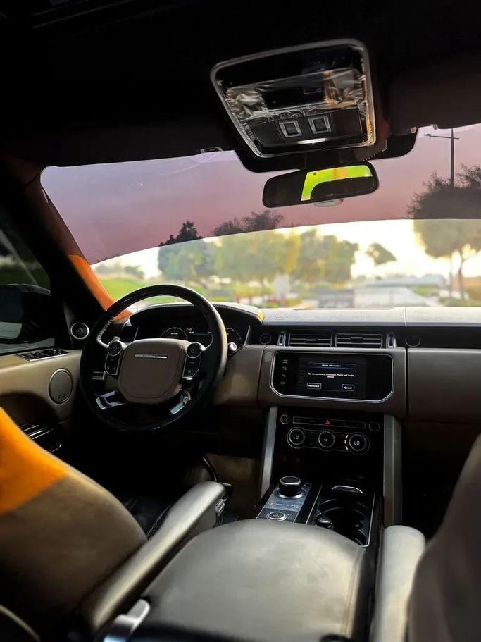Range Rover Vogue V8 SE Model: 2013 GCC Specifications Leather seats, fully equipped panoramic fingerprint, hydraulic, anti-slip, hill descent control, heated steering wheel, cruise control, lane keep assist, seat memory, power folding mirrors, power seats, central refrigerator, radar, voice commands, full steering wheel control, rear air conditioning control, collision mitigation, blind spot monitoring, multiple driving modes, auto hold, 360° parking sensors, rear camera, touch screen, electric pedals.