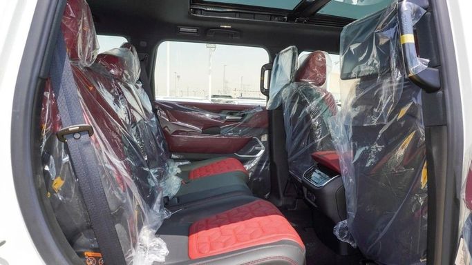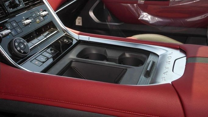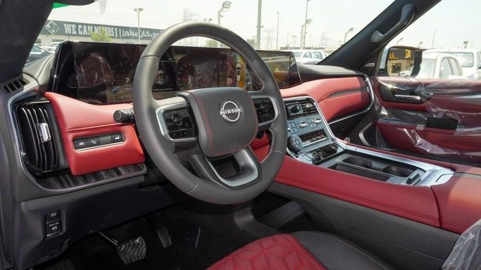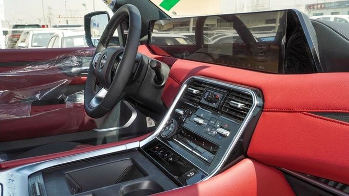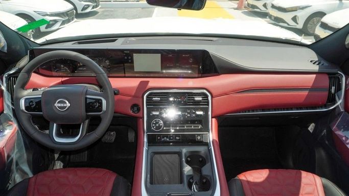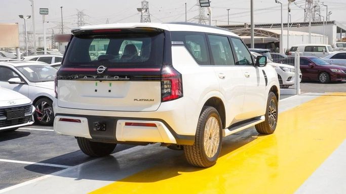 New Nissan Patrol Platinum for sale from GT Motors in Dubai. White 2025 model. The car has automatic gearbox, 6 cylinder engine, 21″ wheels and red interior. GCC specs.
