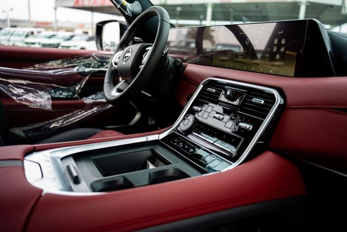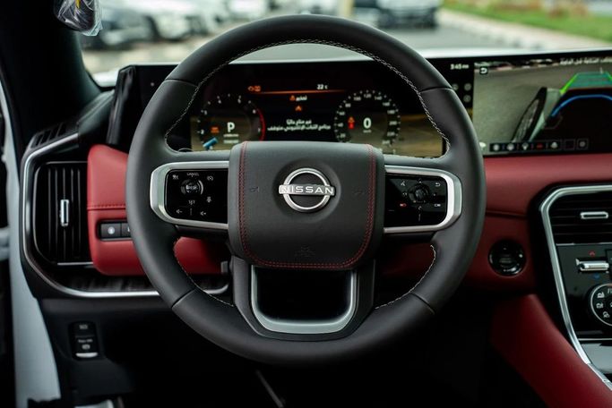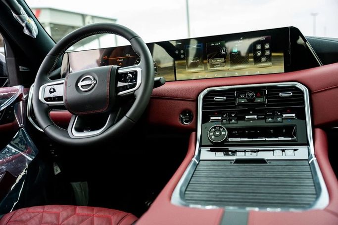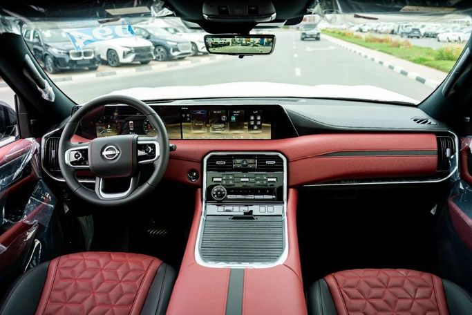 2026 Nissan Patrol Platinum – 3.5L Twin‑Turbo V6 White Roof / Black Body – Dark Red & Black Interior – 7 Electric Seats – 360° Camera Engine & Performance Engine: 3.5L Twin‑Turbo V6 (VR35DDTT) Power: 425 hp Torque: 650–700 Nm (varies by trim) Transmission: 7‑speed or 9‑speed automatic (Platinum uses 9‑speed) Drive system: AWD / 4WD Fuel type: Petrol Fuel tank capacity: ~140 liters Fuel consumption: ~11–12 L/100 km (combined) Dimensions Length: ~5,165 mm Width: ~1,995 mm Height: ~1,940 mm Wheelbase: 3,075 mm Ground clearance: ~272 mm Curb