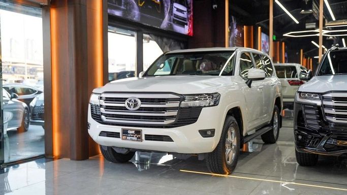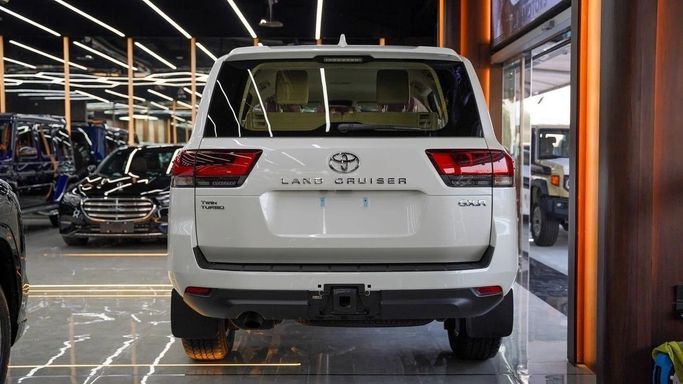 New Toyota Land Cruiser for sale from GT Motors in Dubai. White 2025 model. The car has automatic gearbox, 6 cylinder engine, 18″ wheels and beige interior. GCC specs.