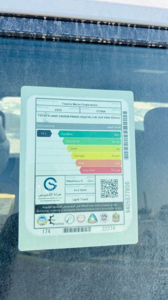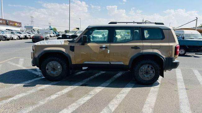 The 2025 Toyota Land Cruiser Prado 250 Series is a new, GCC-spec five-door SUV finished in a warm beige. It pairs a 2.8-liter diesel engine with 204 horsepower to an automatic transmission and all-wheel drive, delivering solid performance for daily driving and versatile capability for varied road conditions. The combination emphasizes a balanced ride, steady highway stability, and confident off-road ability when needed, while the SUV’s rugged construction and practical interior are built for long journeys and everyday use. With a region-focused setup, climate-friendly featu