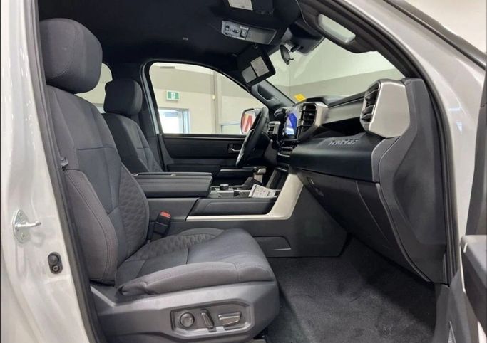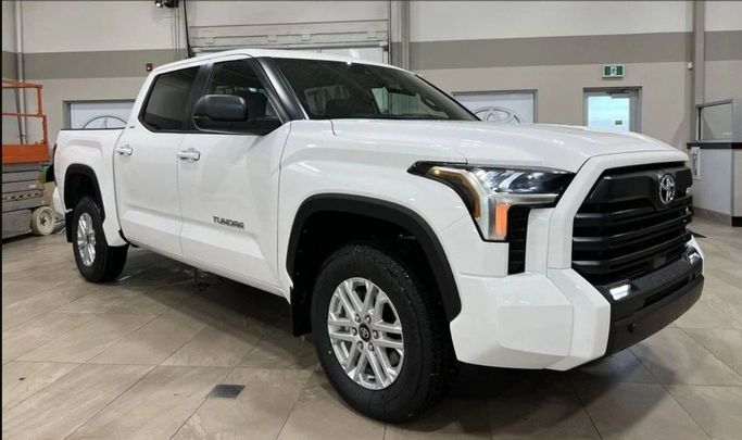 The new 2025 Toyota Tundra III in white is a pickup truck featuring a dual cabin, AWD (all-wheel drive), and an automatic transmission. Under the hood is a 3.4-liter gasoline engine with a capacity of 389 hp, providing confident dynamics and stable traction on various roads. Combined with the comfort of the interior and thoughtful ergonomics of the cabin, it is comfortable for both the driver and passengers. The cargo compartment remains practical for everyday use. The warranty is valid until 02/01/2027, underscoring the reliability and long-term support of the manufacturer