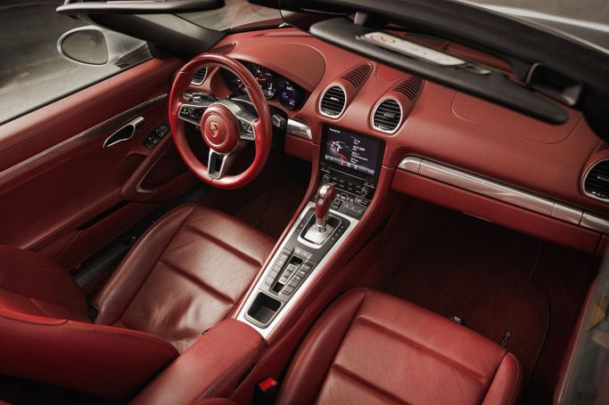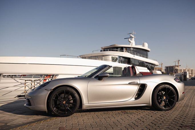 The 2024 Porsche 718 Boxster IV 718 (982) Roadster combines nimble handling with a refined, driver-focused cabin. A 2.0-liter turbo engine delivers 300 horsepower, paired with an automated manual transmission for precise, engaging shifts. The rear-wheel-drive setup emphasizes balance and responsiveness, making it well suited for both city driving and winding roads. In silver with a red interior, the car presents a clean, contemporary look, while the cockpit offers supportive seating and straightforward controls that enhance comfort on longer trips. Open-top driving adds to