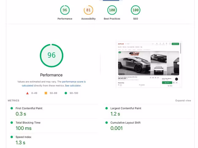 We’ve done it. 🚀 At AUTO.AE, we’ve achieved exceptional website optimization results — with Performance: 96, Best Practices: 100, and SEO: 100. This means your listings now load faster, look smoother, and rank higher than those of our competitors in search engines. Every millisecond we saved, we did it for you — so your cars get seen first.