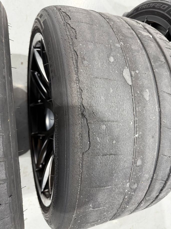 As you can see in the photos, the tires were worn down to the metal cords. Beyond that point, continuing to drive is dangerous: • there’s a risk of tire failure, • potential damage to the fender, • the bumper, • and unnecessary problems on track.