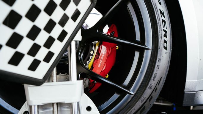 The core of the upgrade involved a complete conversion from the factory carbon-ceramic braking system to steel Girodisc brake rotors combined with Pagid RSL racing brake pads. This configuration delivers stable and predictable braking behavior, high thermal resistance, and extended service life under track use, while significantly reducing operating costs compared to OEM carbon-ceramic components.