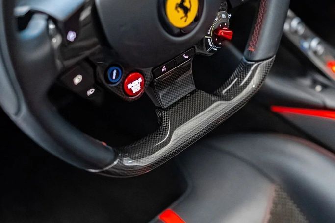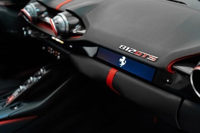2021 Ferrari 812 GTS - Adaptive headlights with SBL function - Back radar - Yellow brake calipers - Carbon fiber inner door handle - Carbon fiber driver zone with LEDs - Carbon fiber central bridge - Exterior sill kick in carbon - Colored inner details - Dash inserts in carbon fiber - Suspension lifter - Cavallino stitched on headrest - Black tailpipe tips - Advanced front driving camera - Additional colored mats with logo - 'Scuderia Ferrari' shields - Parking camera - Passenger display - Yellow rev counter in carbon fiber - Racing seat