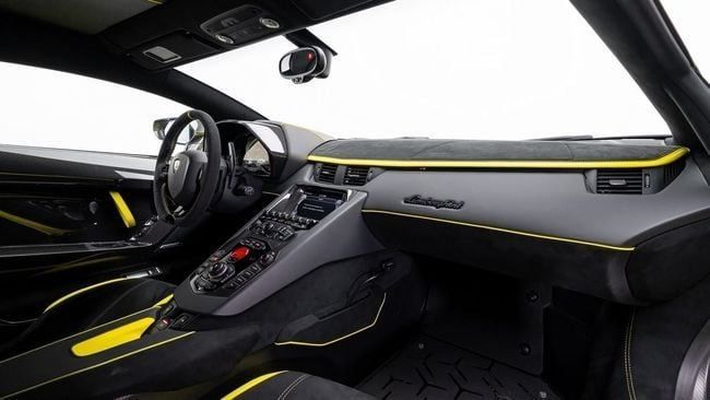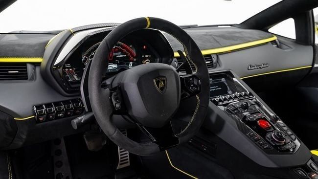 Selling Price: AED 2,150,000 2019 Lamborghini Aventador SVJ 1 of 900 Mileage: 4,357 Km GCC Specs Engine Size: 6.5L V12 Horsepower: 759 HP Exterior Color: Giallo Tenerife Interior Color: Black | Yellow