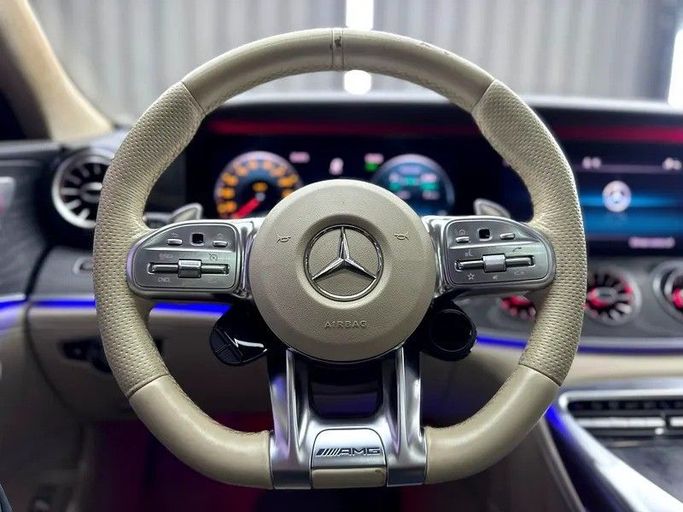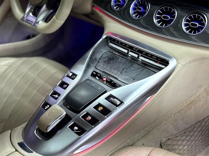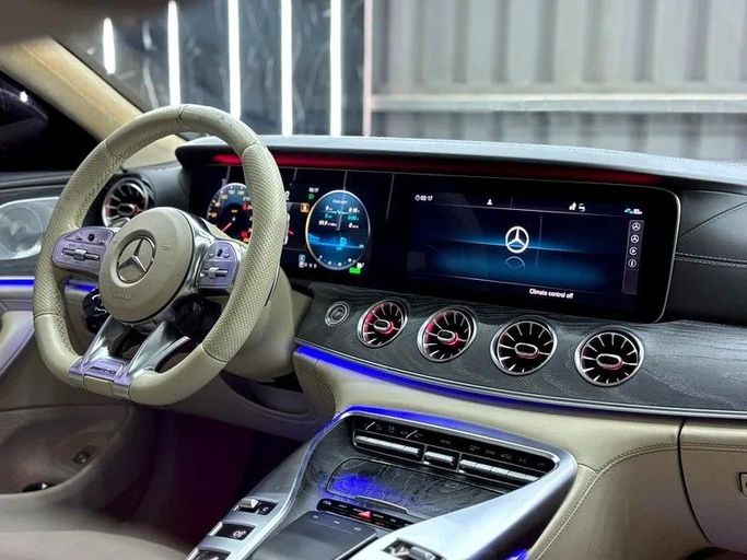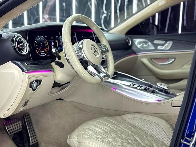 This used 2019 Mercedes-Benz AMG GT 43 in I Facelift trim, presents in a striking blue with a liftback body. It hides a 3.0-liter turbocharged V6 delivering 367 horsepower, paired with a smooth automatic transmission and rear-wheel drive. Built for GCC markets, the car combines performance with a setup suited to the region, and it has a single previous owner from new with 104,720 kilometers on the clock. The AMG GT is known for its poised handling and a driving character that blends everyday usability with enthusiastic performance. The 367 hp figure offers confident accele