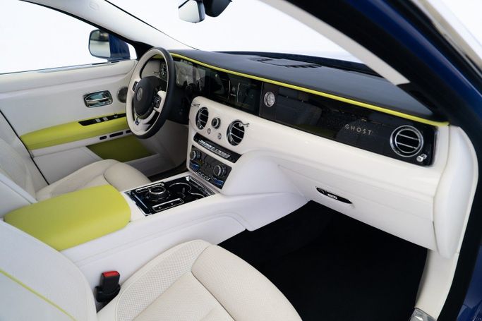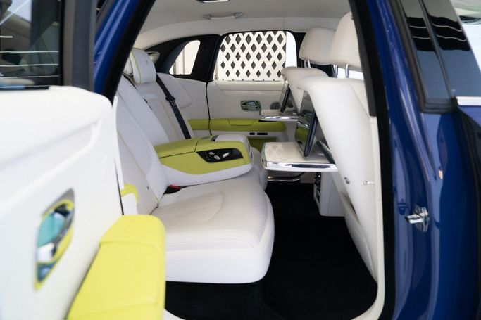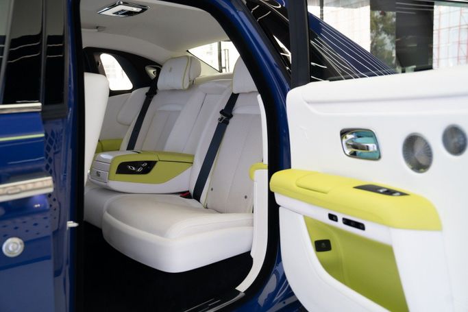 Rolls-Royce Ghost 2023: Unmatched Luxury in Salamanca Blue The 2023 Rolls-Royce Ghost is the epitome of opulence, with a striking Salamanca Blue exterior and a meticulously crafted Ivory and Green interior. Combining classic luxury with contemporary design, this vehicle offers an unparalleled driving and passenger experience, enhanced by starlights and rear entertainment screens. Exterior: A Refined and Distinguished Presence The Salamanca Blue exterior of the Rolls-Royce Ghost exudes elegance and sophistication, with a deep, rich tone that makes a lasting impression. The