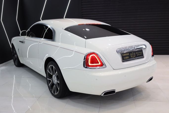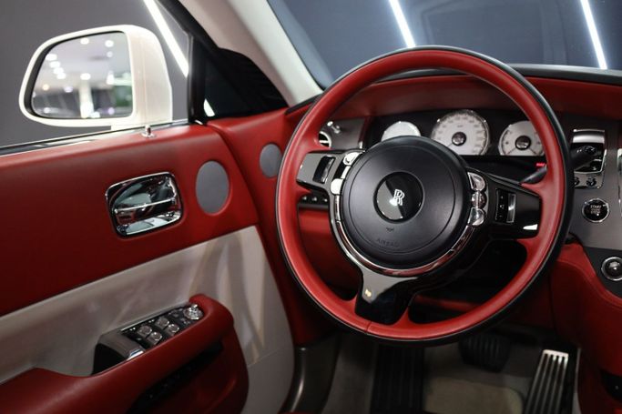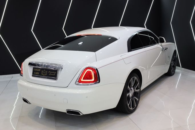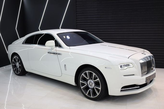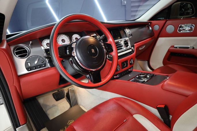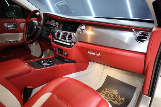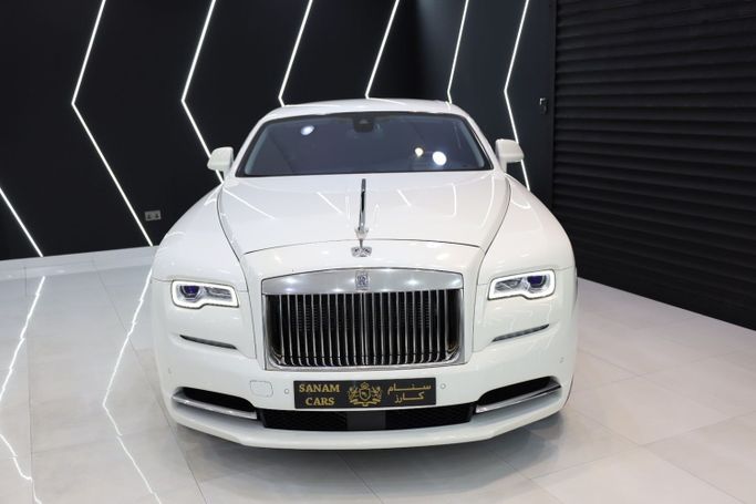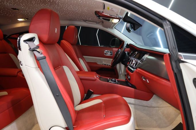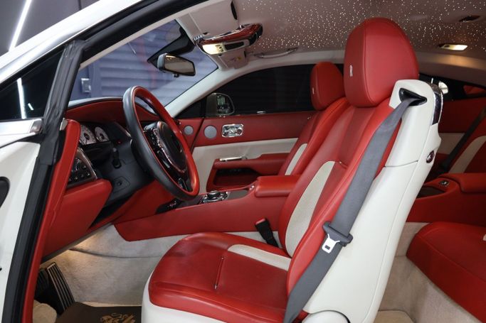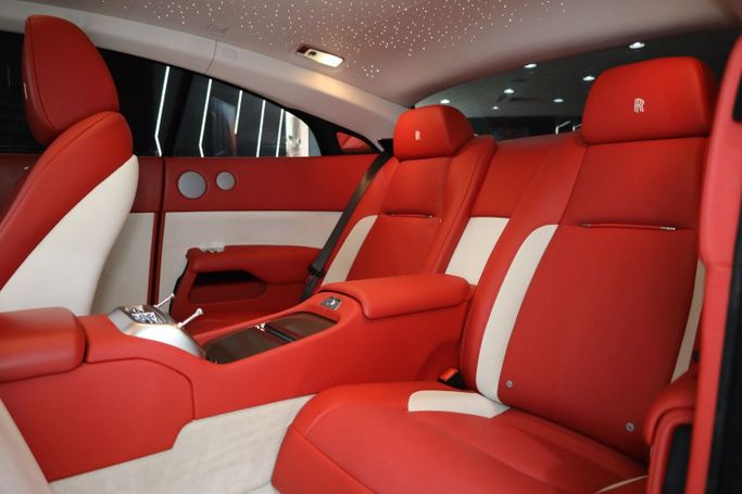 Rolls Royce Wraith GCC Specifications Starlight Headliner Two-Tone Interior Two-Tone Steering Wheel Ventilated Seats Rolls Royce Monogram on Headrests Head-Up Display Night Vision Red Single Coachline 360° Camera 21-Inch Wheels