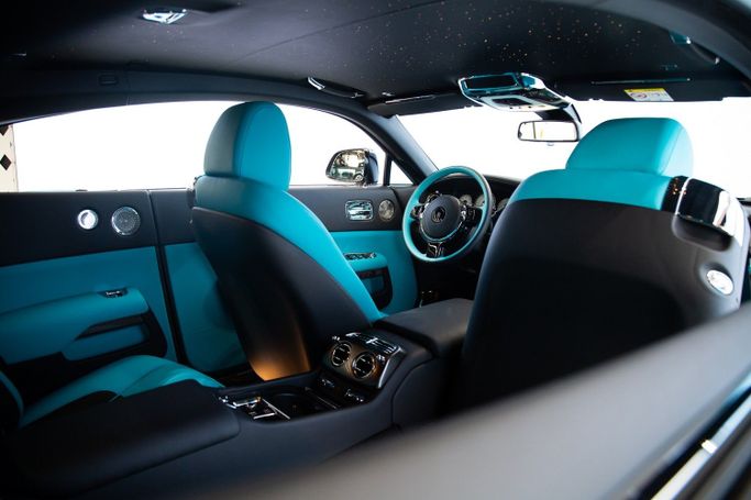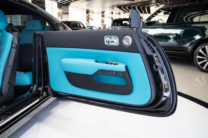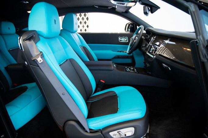 Introducing the new 2023 Rolls Royce Wraith Black Badge, a stunning embodiment of luxury and performance, now available at Exotic Cars Dubai. This exquisite vehicle boasts a sophisticated black and grey exterior, a color combination that perfectly encapsulates its commanding presence and elegant design. The interior is a luxurious mix of Tiffany blue and black, creating a serene and opulent ambiance that is both inviting and stylish. The Wraith Black Badge is renowned for its exceptional craftsmanship and advanced features. This model is enhanced with interior carbon trim,