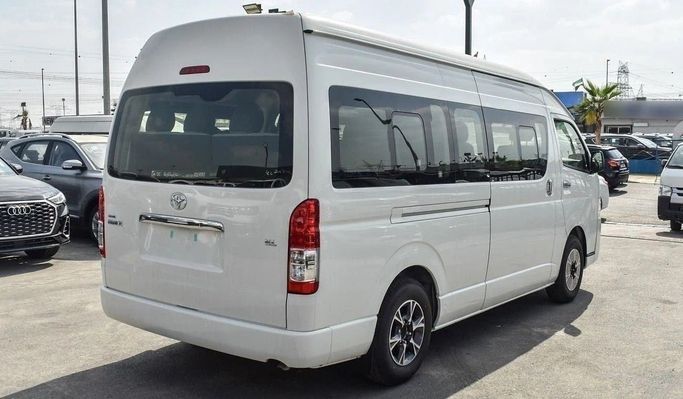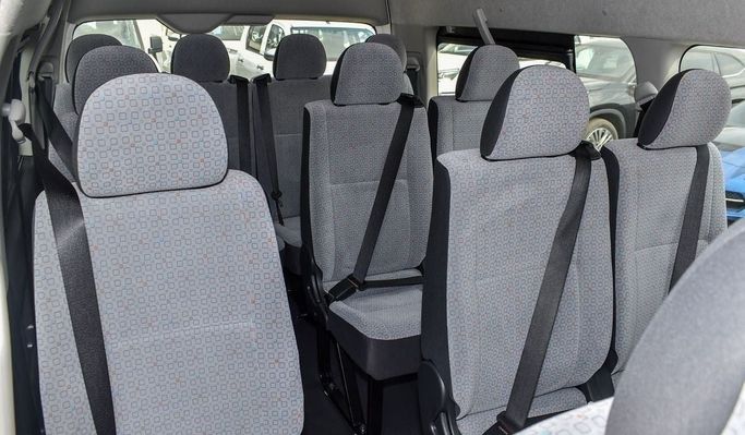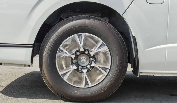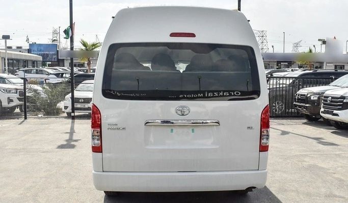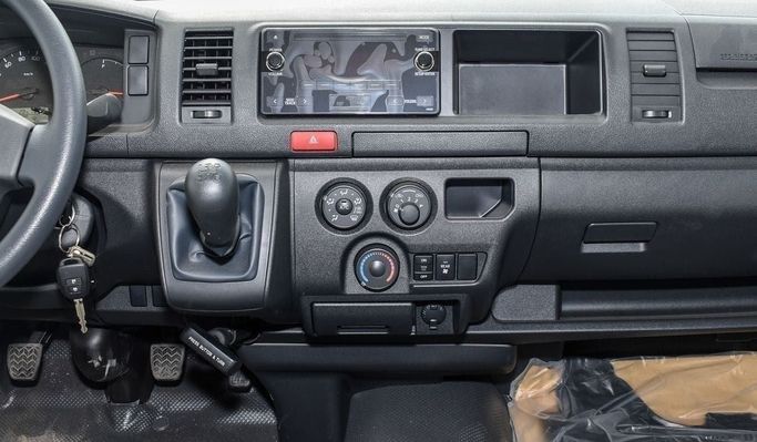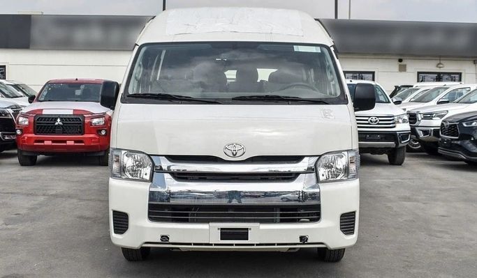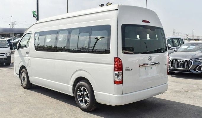 Brand new Toyota Hiace GL for sale in Dubai. White 2024 model, available at This car has manual transmission, 6 cylinder engine, 15″ wheels and grey interior.