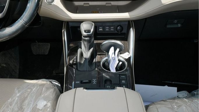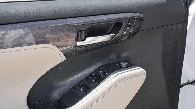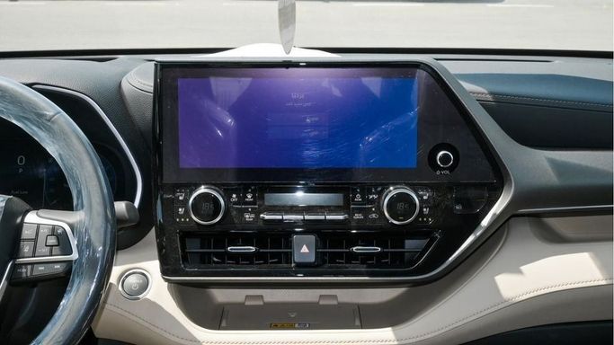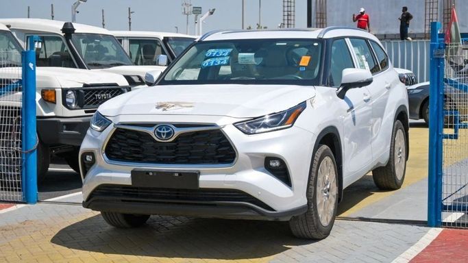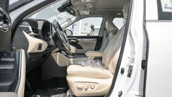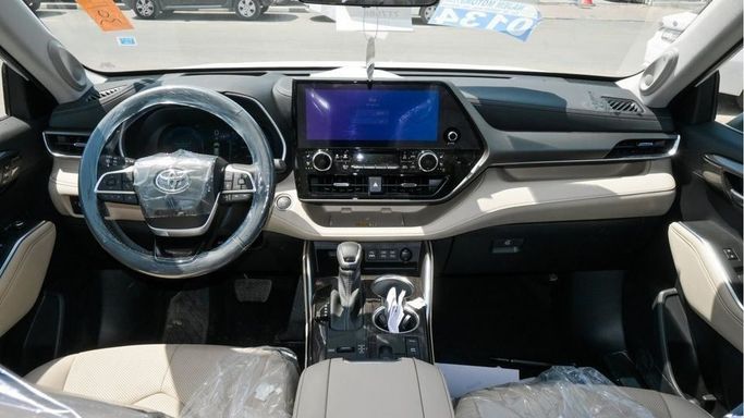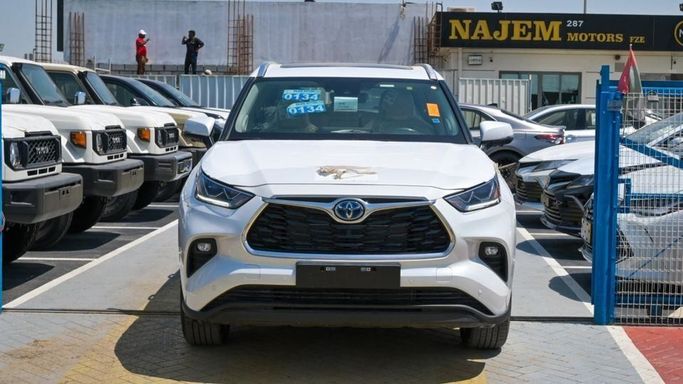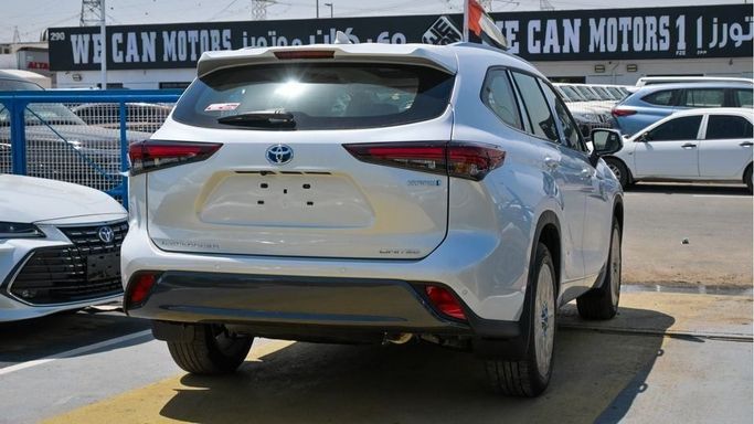 New Toyota Highlander Limited Hybrid 2.5L for sale from Najem Motors FZE in Dubai. White 2024 model. The car has automatic gearbox, 4 cylinder engine, 20″ wheels and beige interior. GCC specs.