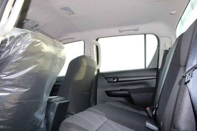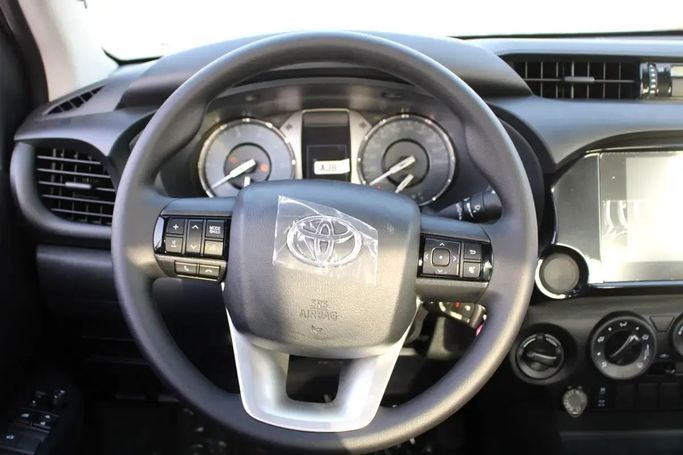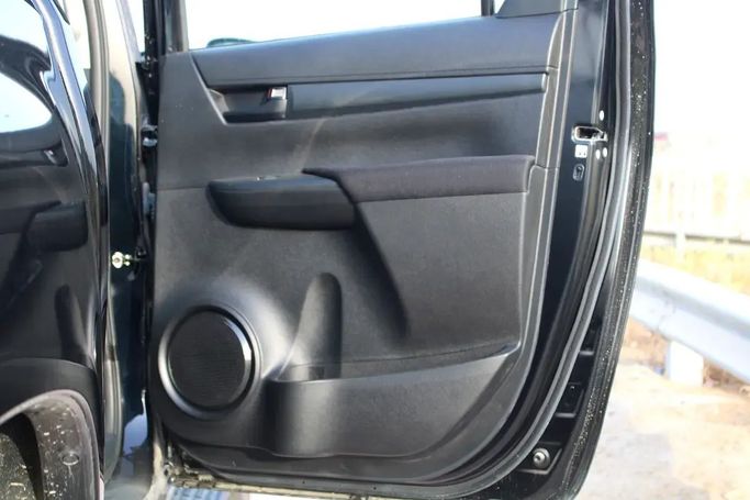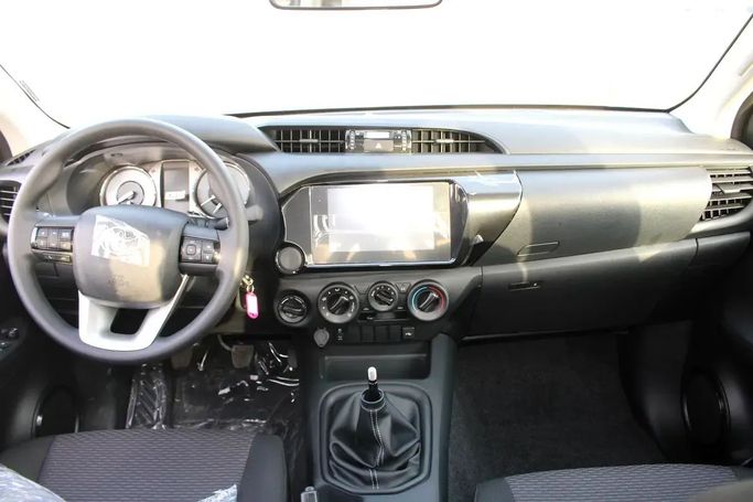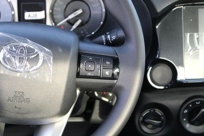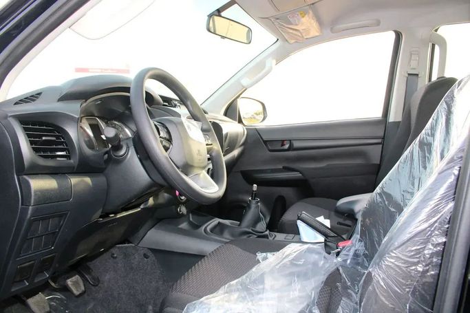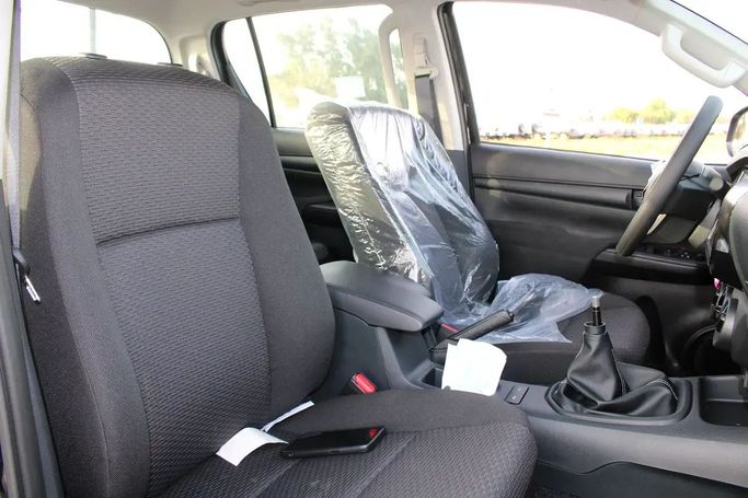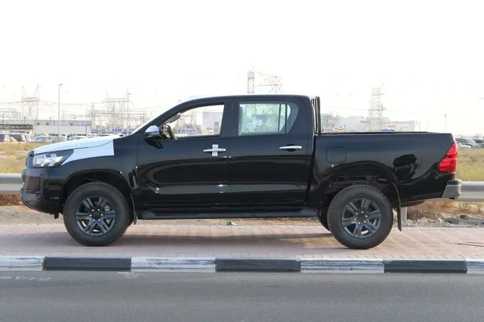 The 2025 Toyota Hilux VIII Facelift is a double-cab pickup truck in black that combines durability, practicality, and modern aesthetics. Under the hood, it features a 2.4-liter diesel engine with a capacity of 150 hp, paired with a manual transmission and all-wheel drive (AWD). This setup provides confident acceleration, good traction, and stability on different surfaces. The facelift updates enhance the character of the vehicle, giving it a more modern appearance, while the deep black color adds an element of rigor and solidity. Inside, the truck offers comfortable seati