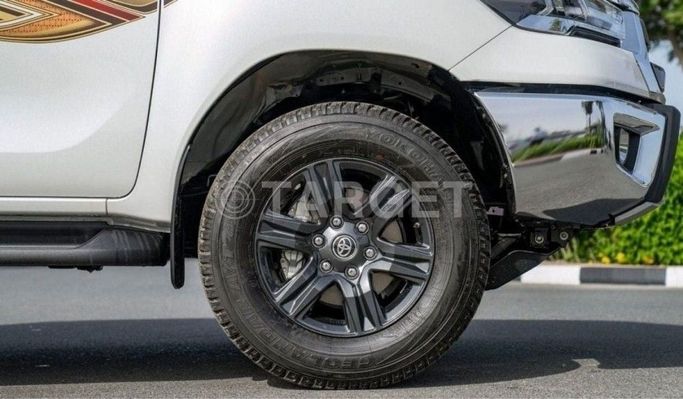 New 2025 Toyota Hilux VIII Facelift, a double-cab pickup in white, pairs a 2.7-liter petrol engine producing 166 horsepower with an automatic transmission and all-wheel drive for steady performance across road and light off-road conditions. The exterior conveys practical, rugged confidence, while GCC-spec equipment ensures the model meets regional needs. Inside, the cabin emphasizes durability and everyday comfort with seating for five, straightforward controls, and a reliable infotainment setup designed for busy routines. Built on Toyota’s track record for reliability, thi