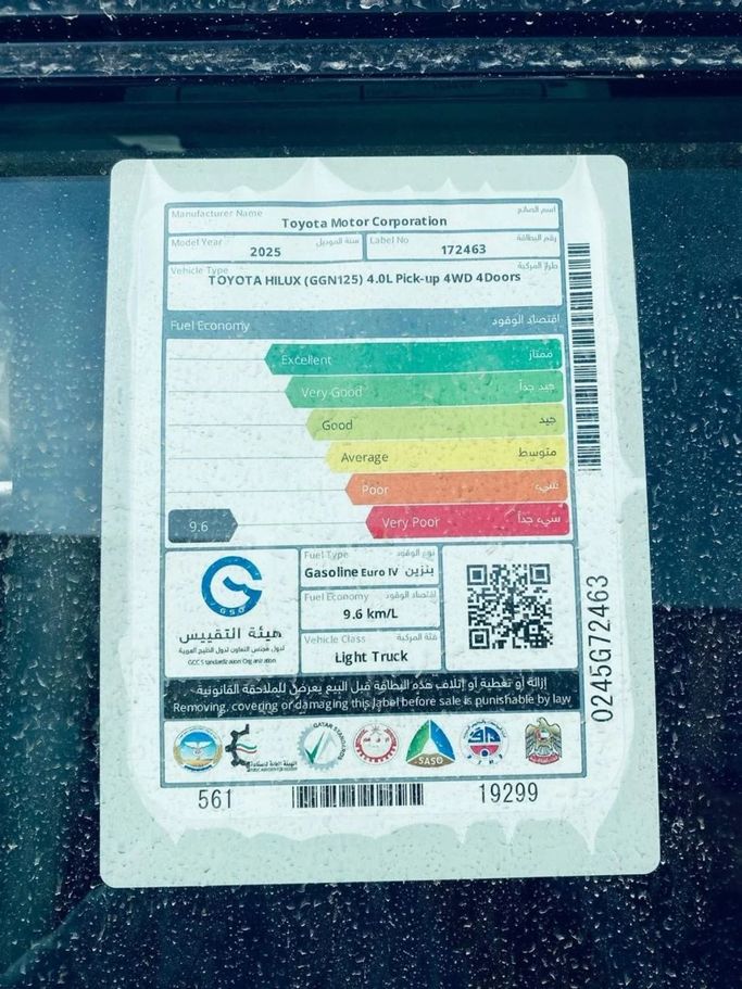 The 2025 Toyota Hilux VIII Facelift in white is a new GCC-spec double-cab pickup that blends everyday practicality with dependable capability. It is powered by a 4.0-liter petrol engine producing 238 horsepower, paired with an automatic transmission for smooth, effortless acceleration. All-wheel drive provides sure footing across varying surfaces, while a capable suspension offers a comfortable ride for daily use and tougher tasks alike. Inside, the double-cab layout fits five and the cabin prioritizes durable materials and straightforward controls, with practical storage a