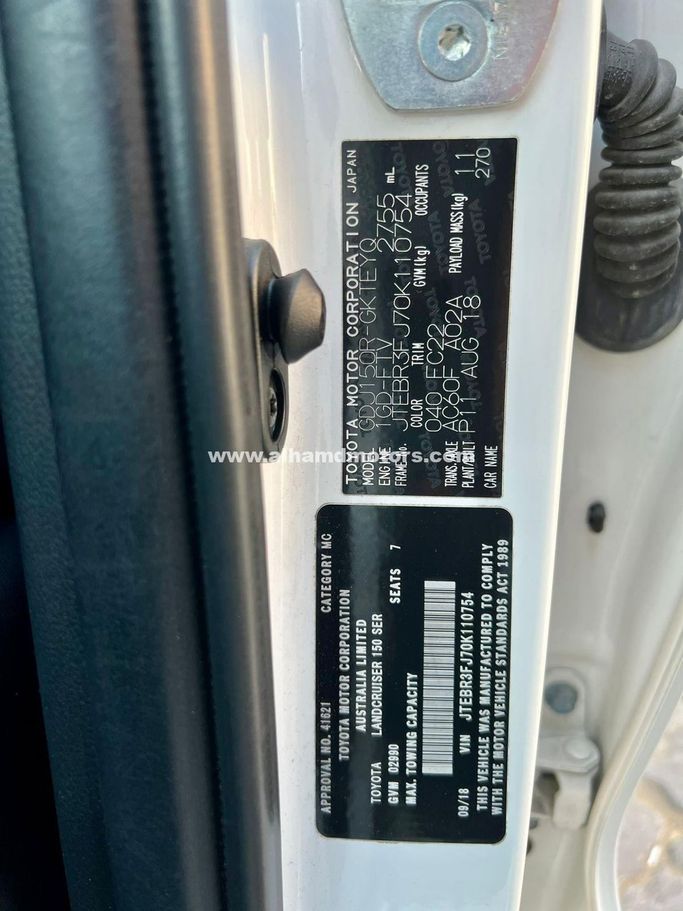 TOYOTA LANDCRUISER PRADO USED VEHICLE COLOUR WHITE MODEL 2018 4WD AUTOMATIC TRANSMISSION DIESEL ENGINE 31500 KM 2.8 LITER 4 CYLIENDER 5 DOOR AC ABS AIR BAG POWER STREEING POWER WINDOW ALLOY WHEEL RADIO FOG LIGHT BACK CAMERA WHEEL SPANNER SIDE AIR BAG USED TYRE AUSTRALIAN SPEC