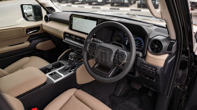 The 2024 Toyota Land Cruiser Prado is a remarkable example of engineering and design, blending luxury with rugged capability. This new model features a sleek black exterior that showcases its bold and commanding presence on the road. As a part of the renowned 250 Series, it comes equipped with a powerful 2.8-liter diesel engine that delivers an impressive 204 horsepower, ensuring that whether on the highway or the toughest off-road terrain, you have the power and reliability you need at your fingertips. As an all-wheel-drive (AWD) SUV, the Land Cruiser Prado excels in dive