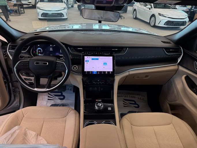 Jeep Grand Cherokee Laredo The model : 2025 Specs : 6 cylinder Engine 3.6 293 horsepower 8 speed automatic transmission Four wheel drive system 7 seater Fuel tank capacity 87 liters Fuel consumption 11.7 kilos per litre good rating His LED lights Size 18 aluminum rails Side mirrors in black Door knobs in burgundy color Smart entry Pedals Rear sensors Beige cloth seats Neutral screen size 10.1 inches Supporting the car play feature Rear camera Drum display screen 10.25 inches Blind dot Warning to Go Off Track Automatic driver's seat Stretching his fingerprint Bluetooth Cont