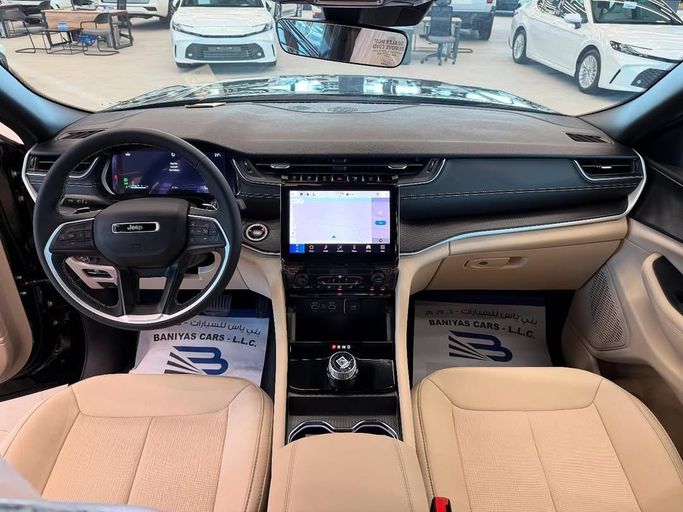 Jeep Grand Cherokee Laredo The model : 2025 Specs : 6 cylinder Engine 3.6 293 horsepower 8 speed automatic transmission Four wheel drive system 7 seater Fuel tank capacity 87 liters Fuel consumption 11.7 kilos per litre good rating His LED lights Size 18 aluminum rails Side mirrors in black Door knobs in burgundy color Smart entry Pedals Rear sensors Beige cloth seats Neutral screen size 10.1 inches Supporting the car play feature Rear camera Drum display screen 10.25 inches Blind dot Warning to Go Off Track Automatic driver's seat Stretching his fingerprint Bluetooth Cont