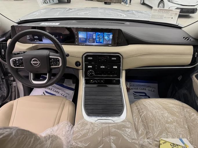 Nissan Patrol SET2 without turbo Model : 2026 Specs : 6 cylinder Engine 3.8 316 horsepower 386 newton meters resolution 9 speed automatic transmission Fuel tank capacity 97 liters Fuel consumption 9.5 per litre LED Headlights Frontal sensations Aluminum rings, size 18 charred Black folding side mirrors Smart key + auto lock when distancing + auto unlock when approaching Rear sensors Remote operating Electricity bottle Air machine Beige leather seats Width screen size 12.3 inches 2 rear cameras Djtel's drum screen Driving positions Double light and heavy Your hand is behin