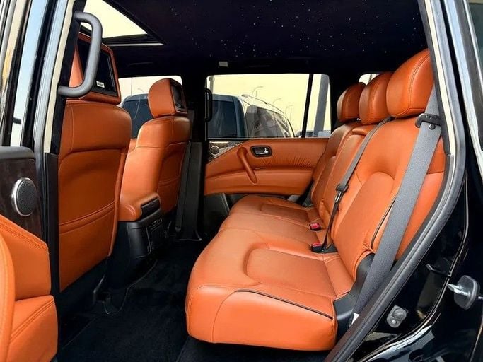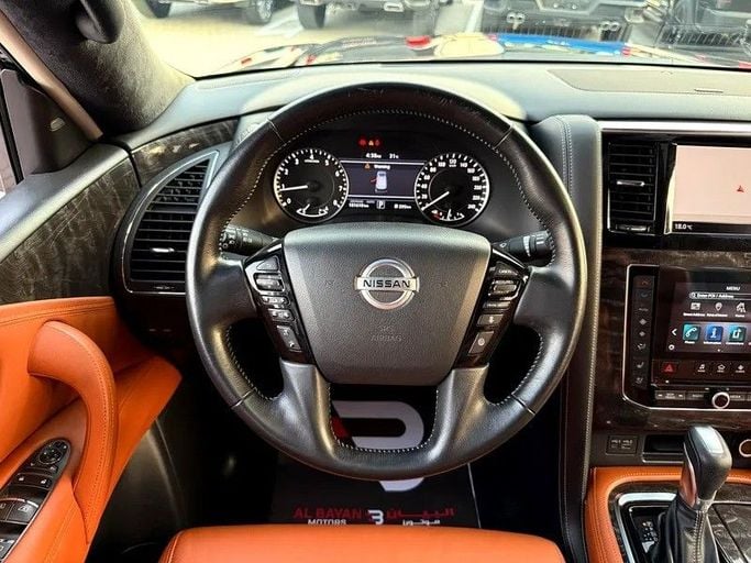 This 2020 Nissan Patrol LE Titanium is a full-size SUV built to handle challenging terrain and long-distance travel with ease. Under the hood sits a 5.6-liter V8 petrol engine producing 400 horsepower, paired with an automatic transmission and all-wheel drive. The exterior is a deep black, and it carries GCC specifications, aligning with local market expectations and equipment. Inside, the Patrol offers a spacious cabin designed for comfort on extended journeys, with seating for multiple occupants and versatile cargo space. The mix of V8 power and AWD translates into confi