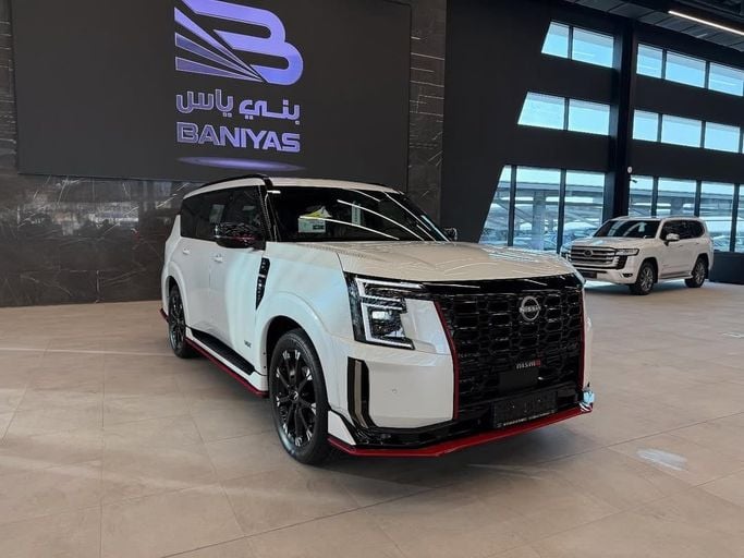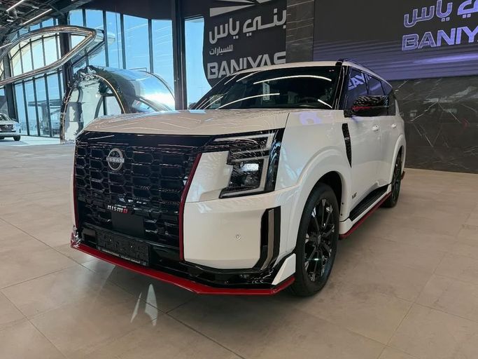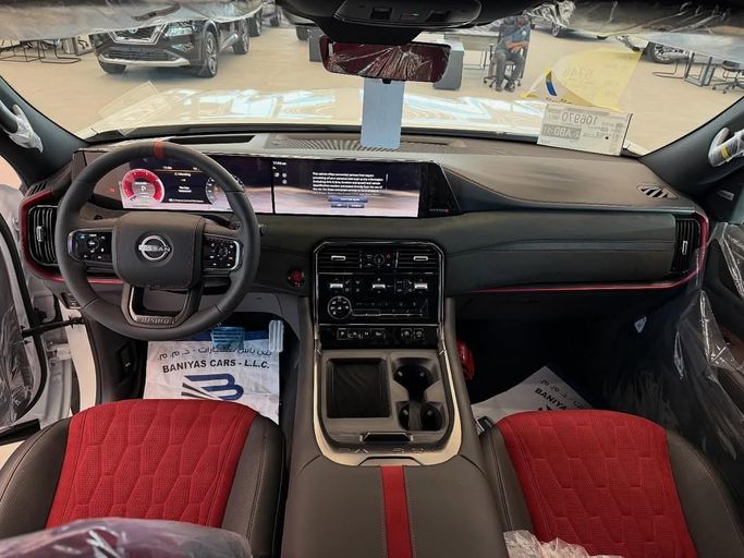 Nissan Patrol Nismo Model : 2026 Specs : 6 cylinder engine 3.5 liters 495 horsepower 700 rpm 9 speed automatic transmission Fuel tank capacity 97 LED lights City supporters Size 22 aluminum rims Front and rear sensors Folding side mirrors flasher signs 4 door fingerprint entry My back ward Electricity bottle Remote operating Automatic rear seat lowers Rear Air Machine Red and black leather seats Panorama roof opening Two screens, front width, size 12.3 inches Surrounding Cameras 360 Automatic hydraulic Warning to Go Off Track Front and rear collision alert Blind dot Stayin
