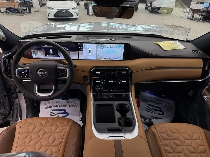 Nissan Patrol Platinum without turbo Model : 2026 Specs : 6 cylinder Engine 3.8 316 horsepower 386 newton meters resolution 9 speed automatic transmission Fuel tank capacity 97 liters LED Headlights كشافات Frontal sensations Aluminum rings, size 18 charred Black folding side mirrors Smart key + auto lock when distancing + auto unlock when approaching جناح Rear sensors Black and brown cloth seats Display screen size 14 inches Rear camera Djtel's drum screen Driving positions Double light and heavy Your hand is behind me Automatic hand brake Auto start Otto hold His refrige