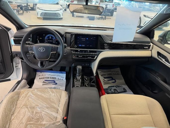 Toyota Camry 4 Cylinder XLE Model : 2025 Specs : 4 cylinders Engine 2.5 201 horsepower 8 speed automatic transmission Fuel tank capacity 60 liters Fuel consumption is 17.1 LED lights 4 frontal senses Size 17 aluminum rails Folding side mirrors with flasher signs Door knobs albadi color Smart entry The 4 senses behind the scenes Beige cloth chairs Hole roof Glass of information. Rear camera Automatic hand brake Wireless charger Running his fingerprint Skin dwellers Bluetooth Control the voice commands. Control the count of flights Automatic driver's seat