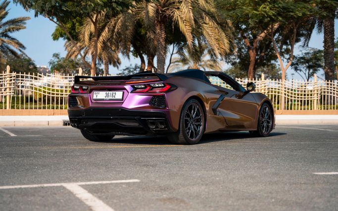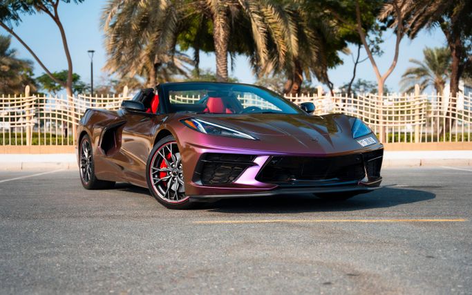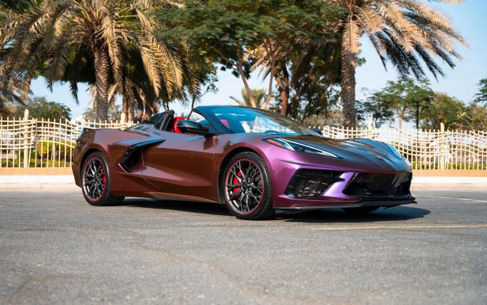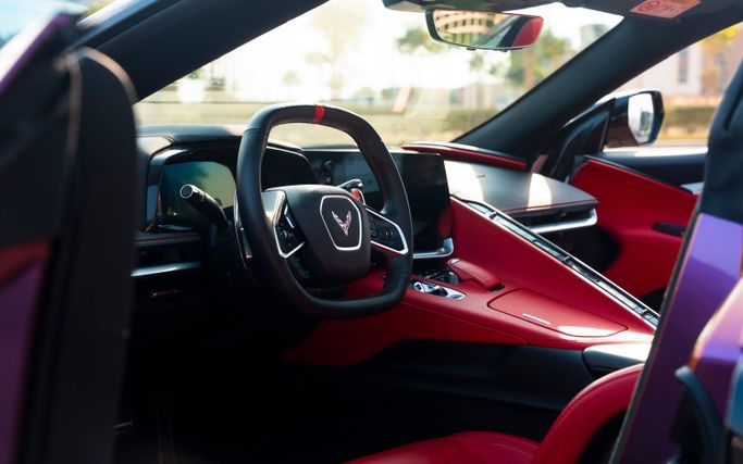 Experience the thrill of driving a Chevrolet Corvette C8 Cabriolet, a car that effortlessly combines luxury and performance, available for rent at Macan Luxury Motors. This stunning purple beauty, with its striking red interior, is the embodiment of sophistication and power, designed to capture the essence of the open road. With a robust 6.2-liter engine delivering an exhilarating 495 horsepower, every drive becomes an unforgettable adventure. Driving the Corvette C8 in the vibrant landscapes of the UAE is an experience like no other. Imagine cruising along the palm-lined