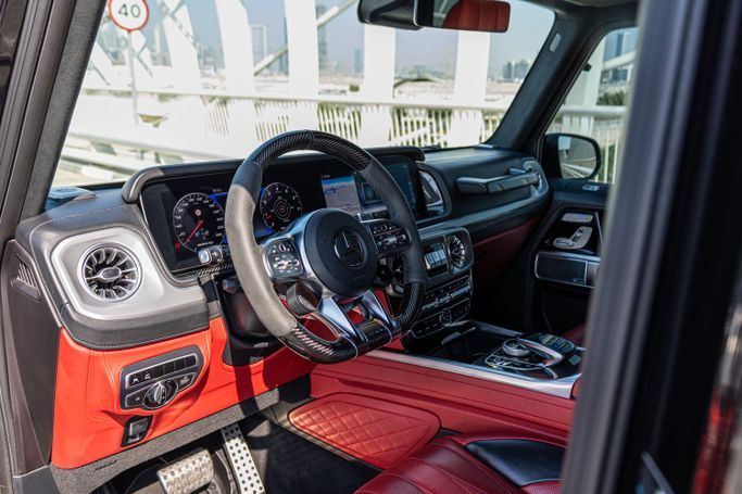 The Mercedes G63 AMG stands as a symbol of unmatched luxury and rugged power. This iconic SUV blends legendary off-road capabilities with the AMG performance engineering and supreme comfort, making it a top choice for adventure and style enthusiasts. Exterior: ◾ Bold AMG-specific front grille with vertical chrome slats and the iconic three-pointed star emblem ◾ Multi-beam LED headlights with LED daytime running lights for excellent visibility ◾ Flared wheel arches with AMG 21-inch alloy wheels, with optional 22-inch wheels for a commanding presence ◾ Side-mounted exhaust