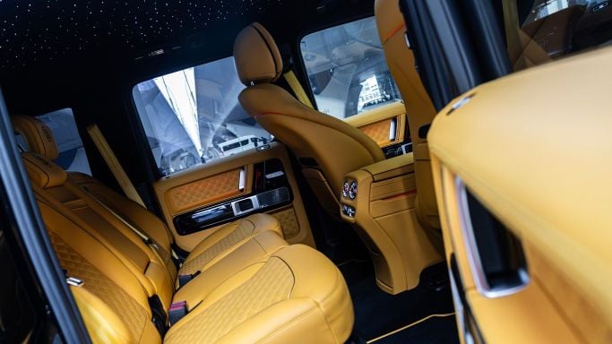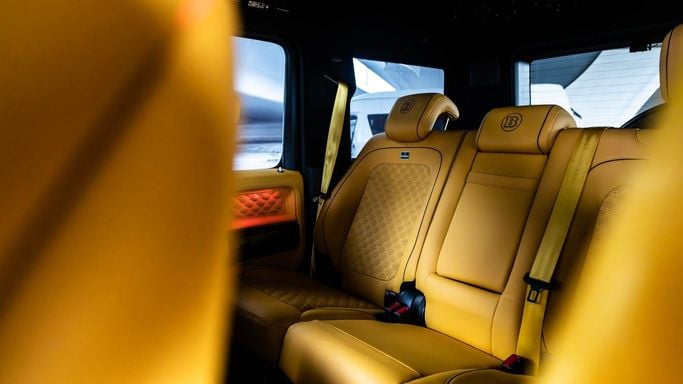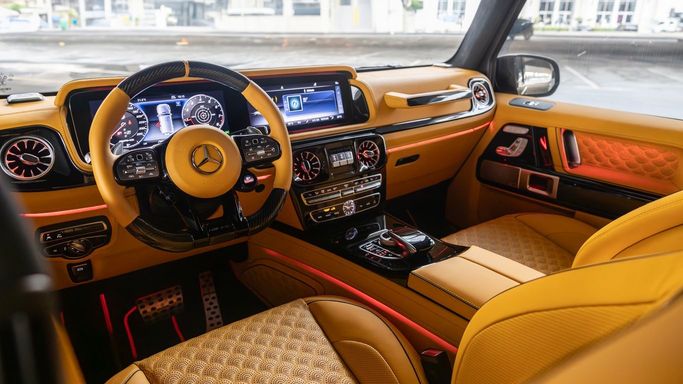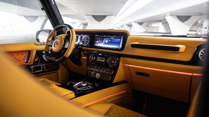 Introducing a unique opportunity to rent the legendary Mercedes-Benz G-Class AMG from AVA Car Rental, the perfect companion for your journey through the enchanting landscapes of the United Arab Emirates. This powerful SUV combines luxury and performance, making it an indispensable partner for any adventure. With its black exterior and golden interior, the G-Class AMG exudes majesty and sophistication. Its aggressive lines and commanding silhouette are sure to turn heads wherever you go. Boasting a maximum power of 800 horsepower and accelerating from 0 to 100 km/h in just
