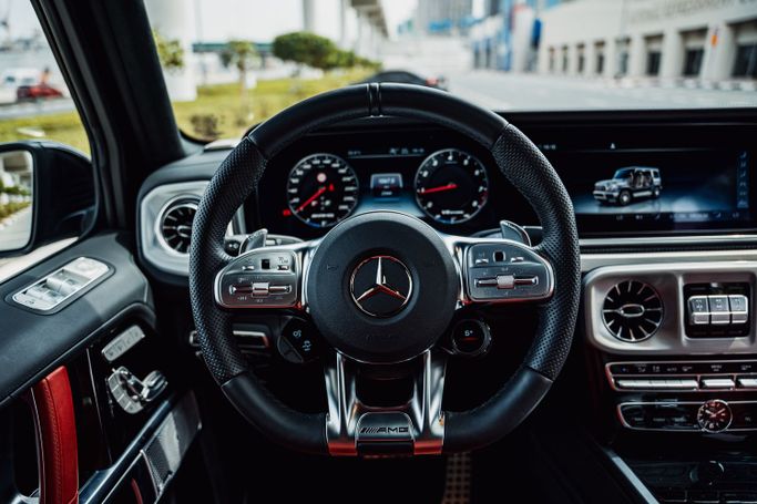 The Mercedes G63 AMG stands as a symbol of unmatched luxury and rugged power. This iconic SUV blends legendary off-road capabilities with the AMG performance engineering and supreme comfort, making it a top choice for adventure and style enthusiasts. Exterior: ◾ Bold AMG-specific front grille with vertical chrome slats and the iconic three-pointed star emblem ◾ Multi-beam LED headlights with LED daytime running lights for excellent visibility ◾ Flared wheel arches with AMG 21-inch alloy wheels, with optional 22-inch wheels for a commanding presence ◾ Side-mounted exhaust