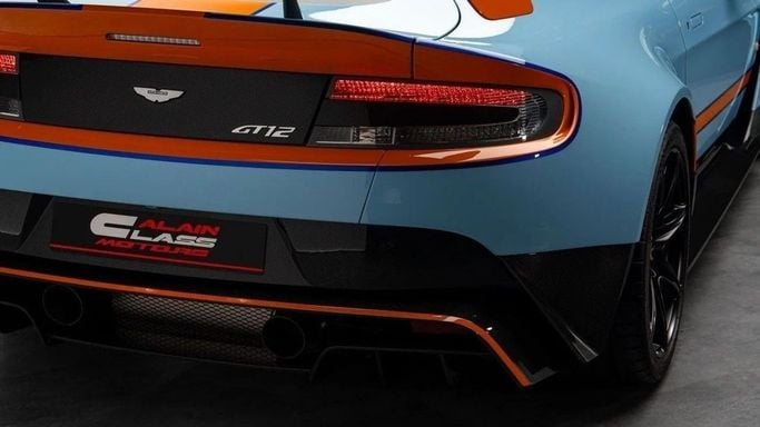 Selling Price: AED 1,550,000 2016 Aston Martin Vantage GT12 Mileage: 32 Km GCC Specs Engine Size: 6.0L V12 Horsepower: 600 HP Exterior Color: Gulf Blue | Orange Interior Color: Black Alcantara | Californian Poppy INTERIOR TRIM Upper Instrument Panel: Black Alcantara (Contemporary) (Alcantara) Environment 1: Black Alcantara (Contemporary) (Alcantara) Environment 1 Stitching: Match to Leather Environment 1 Environment 2: Pure Black (Design Palette) (Caithness Leather) Environment 2 Stitching: Californian Poppy Seat Outer Colour: Black Alcantara (Contemporary) (Alcantara) Seat