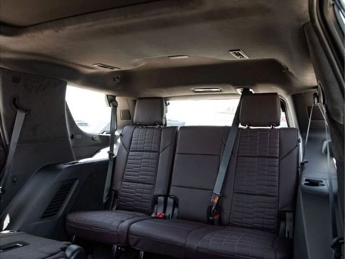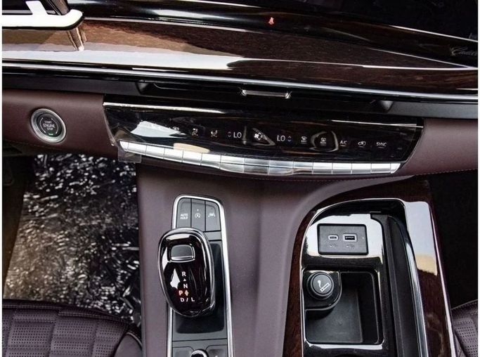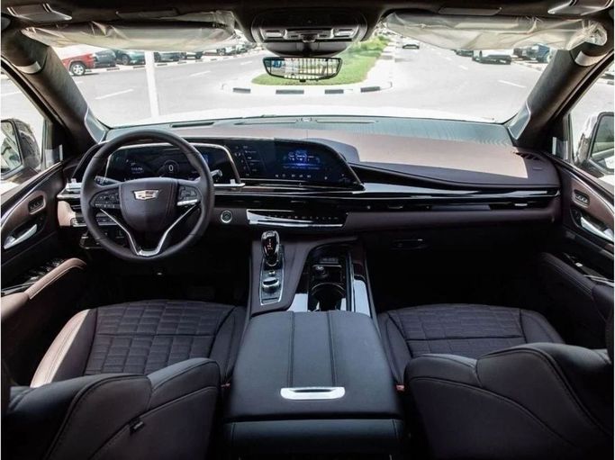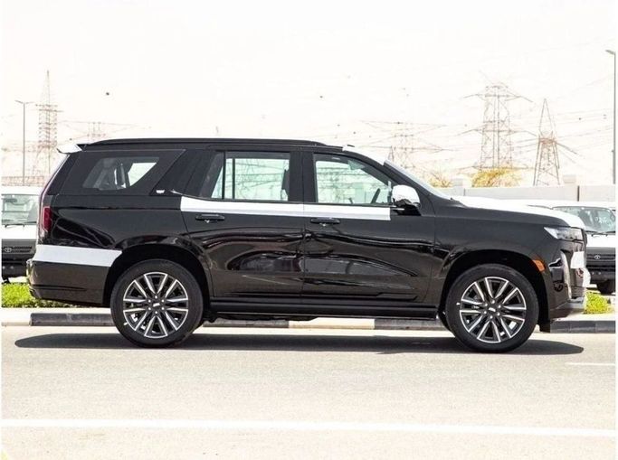 Cadillac Escalade SPORT PLATINUM. GCC Specs Panorama Roof, 360 camera, Rear TVs, 36 speakers 6.2L V8, 4WD Black, interior Brown 7 seats.