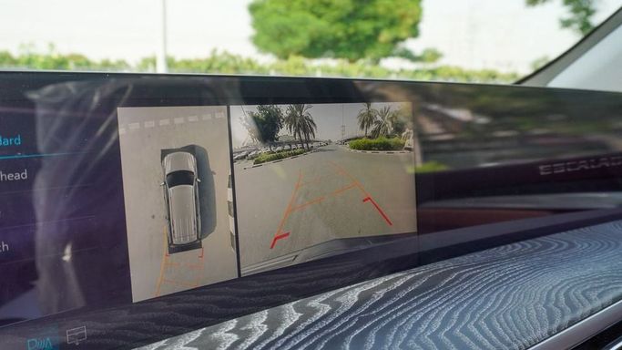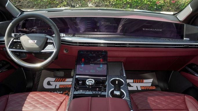 New Cadillac Escalade 600 for sale from Najem Motors FZE in Dubai. Grey 2025 model. The car has automatic gearbox, 8 cylinder engine, 22″ wheels and red interior. GCC specs.