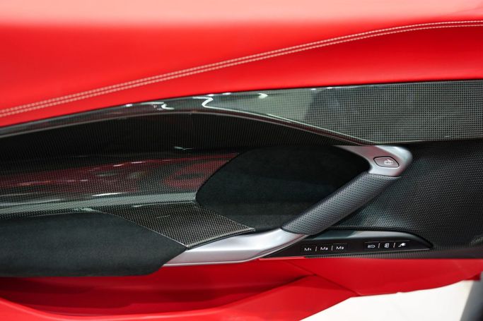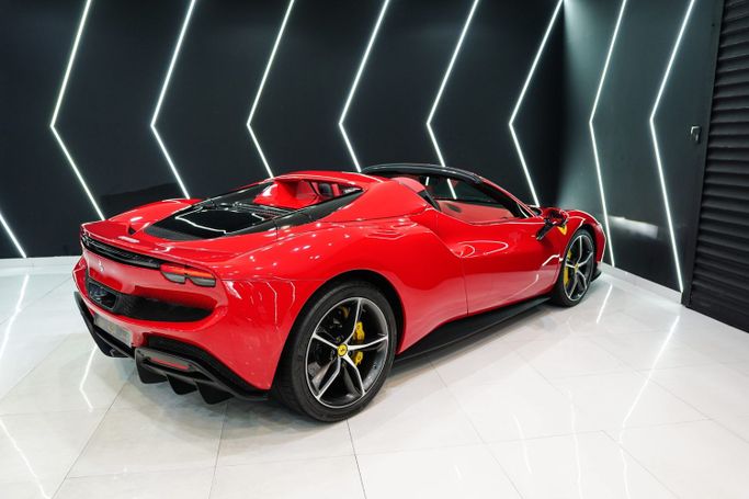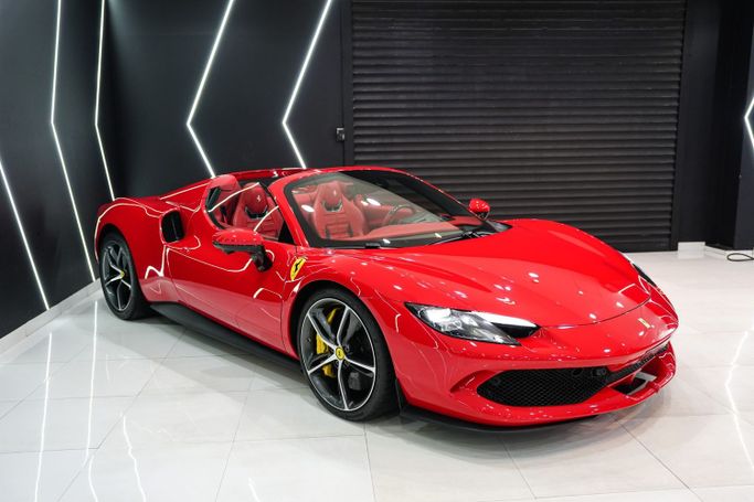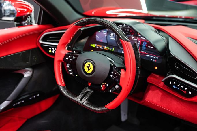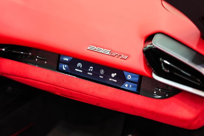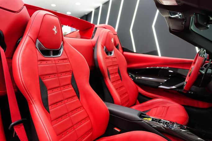 Ferrari 296 GTS GCC Specifications Full Body Paint Protection Film Adaptive Front Light System Airbrushed Shield Carbon Fiber Door Panels Upper Part of Center Console in Carbon Fiber Red Seat Belts Dashboard Inserts in Carbon Fiber Daytona Seats Dual Color Leather Interior Trim (Rosso Ferrari 130421) Front Lift Cavallino Stitched on Headrest (Grigio Chiaro 0326) Black Tailpipe Tips Handy Fire Extinguisher Run Flat Tires Carbon Fiber Steering Wheel with LEDs Electrochromic Rear-View Mirror Ventilated Full Electric Seats Custom Specifications Colored Special Stitching (Grigi
