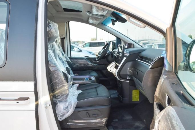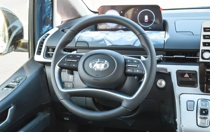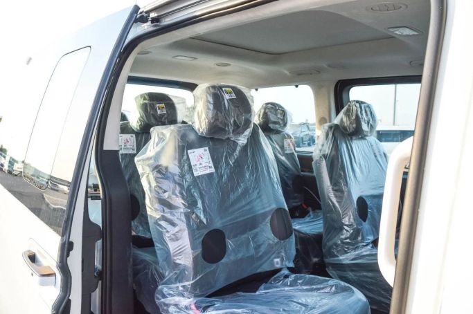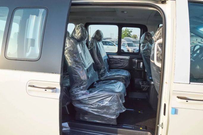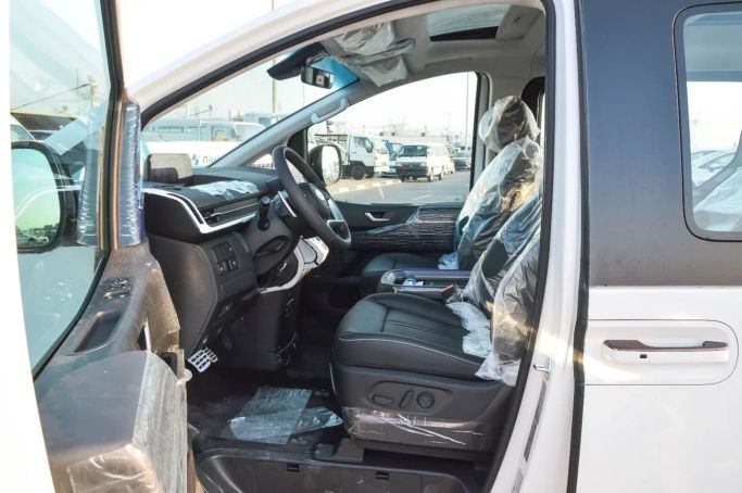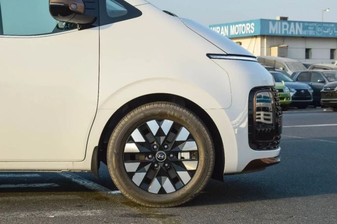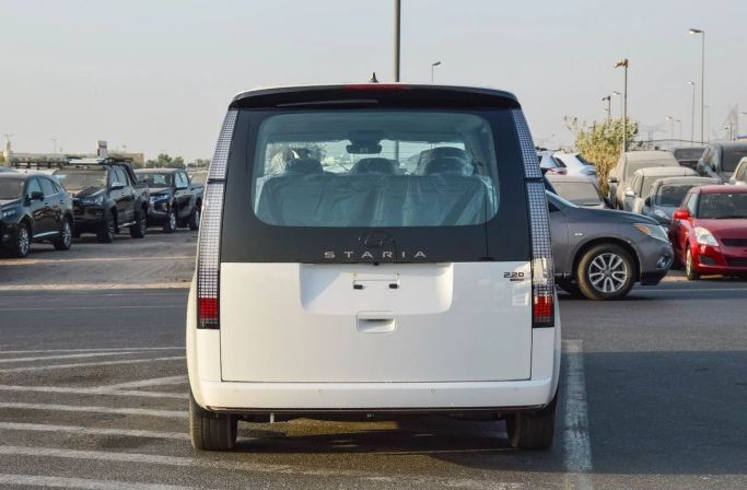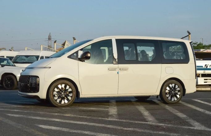 New 2025 Hyundai Staria van in white, powered by a 2.2-liter diesel engine producing 177 horsepower and paired with an automatic transmission in a front-wheel-drive setup. This combination offers efficient performance and smooth operation for daily use, whether transporting people or cargo. Inside, the Staria provides a spacious, adaptable cabin with flexible seating and generous storage to suit varying loads and passenger needs. The exterior presents a clean, contemporary look with a broad silhouette and wide glass areas that contribute to a bright, open feel inside. With