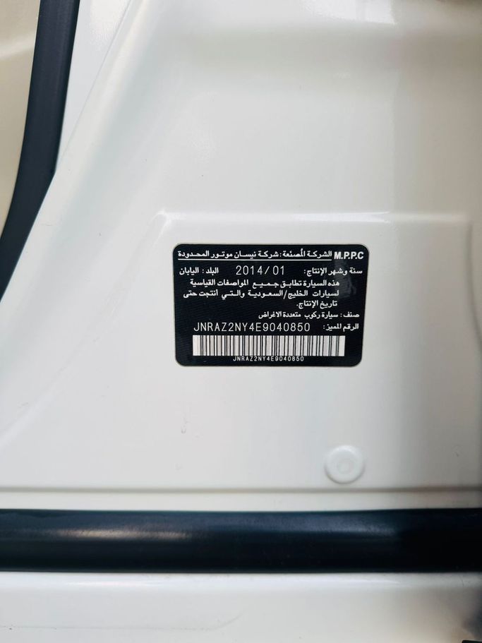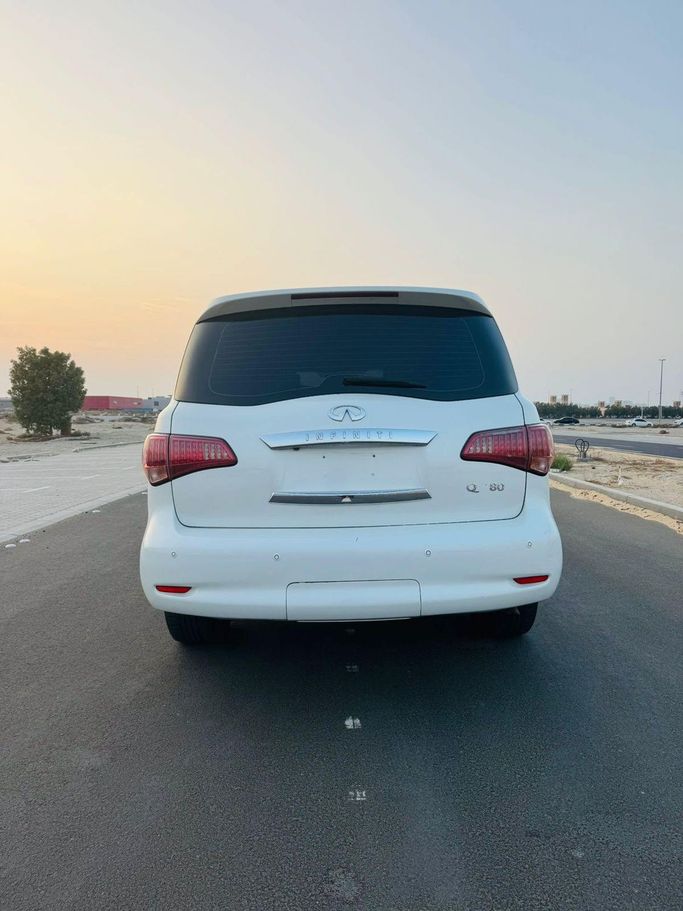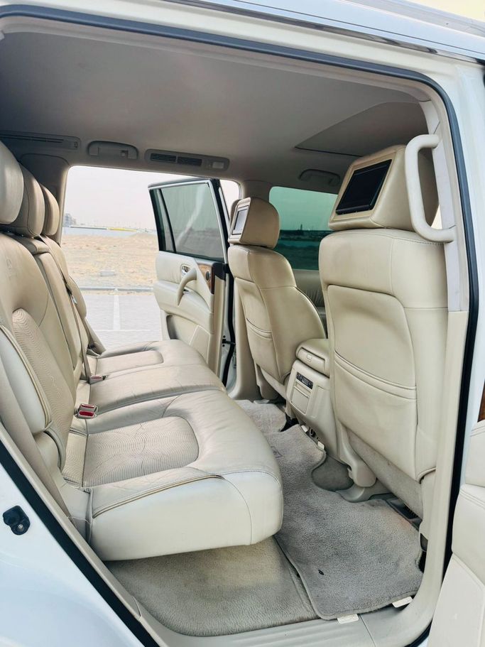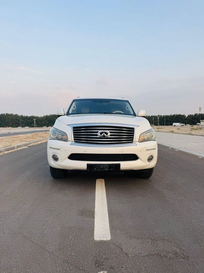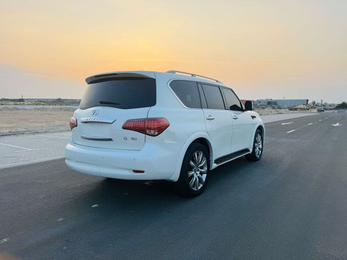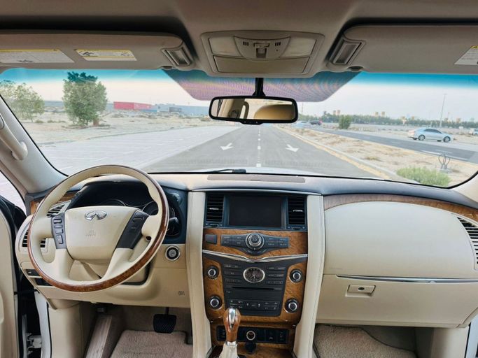 Infinti QX80 Gulf white color Full car option Specifications.. Automatic transmission Four-wheel drive system Sunroof Touch screen Luxury sound system 360 cameras . Full sensors Keyless entry and fingerprint operation Beige seats AC control front and rear Cruise control and full steering control .Rear screens LED headlamps . Model year 2014 193,000 km Required 40,000
