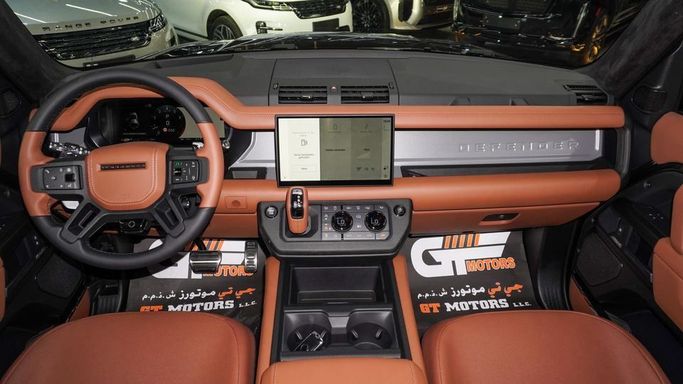 New 2025 Land Rover Defender for sale in Dubai. Available from Najem Motors FZE. Automatic transmission, 8 cylinder engine, 22″ wheels and tan interior. Never driven, European specs.