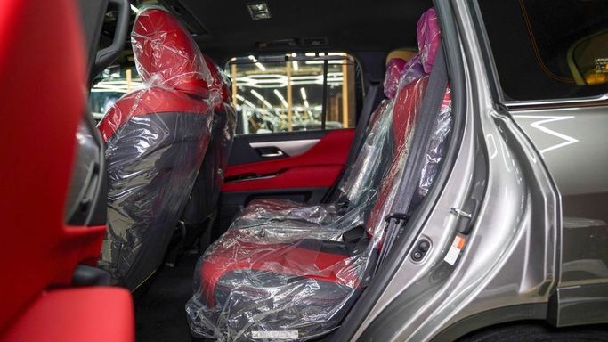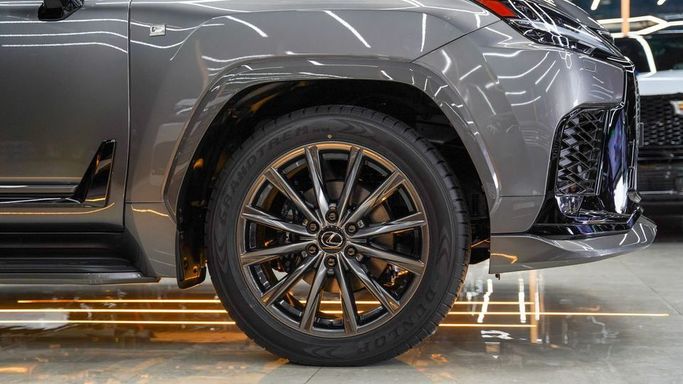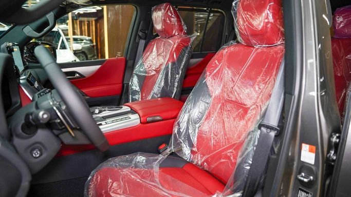 New Lexus LX600 for sale from Najem Motors FZE in Dubai. Grey 2025 model. The car has automatic gearbox, 6 cylinder engine, 22″ wheels and red interior. GCC specs.