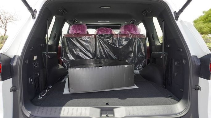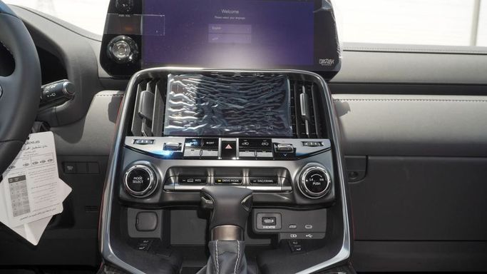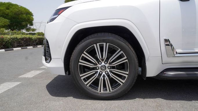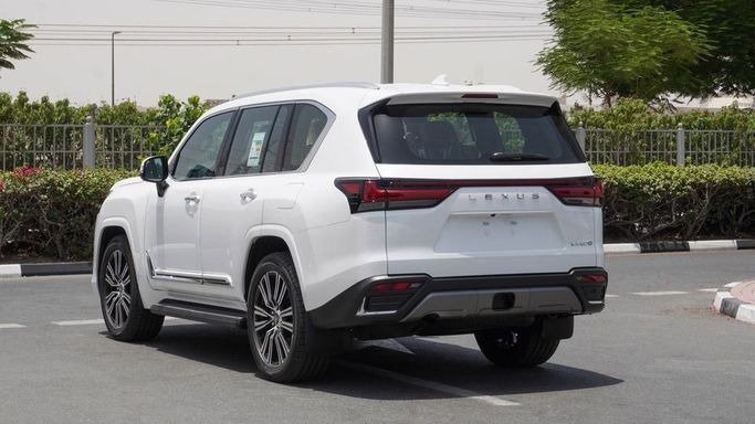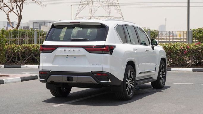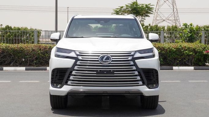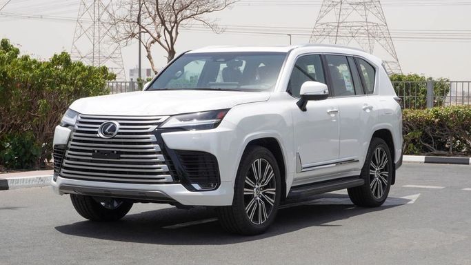 New Lexus LX600 3.5 L V6 for sale from Najem Motors FZE in Dubai. White 2025 model. The car has automatic gearbox, 6 cylinder engine, 20″ wheels and red interior. GCC specs.