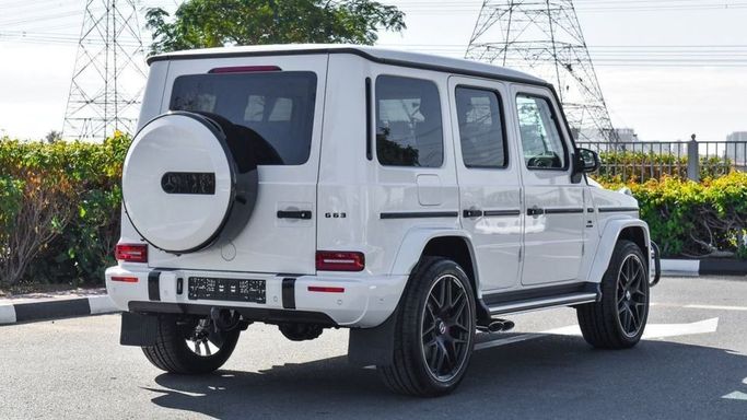 New Mercedes-Benz G 63 AMG for sale from Najem Motors FZE in Dubai. White 2023 model. The car has automatic gearbox, 8 cylinder engine, 22″ wheels and beige interior. Other specs.