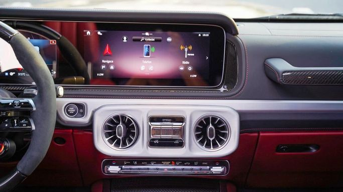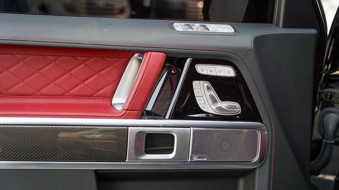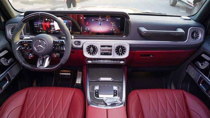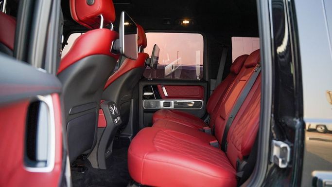 New Mercedes-Benz G 63 AMG for sale from Najem Motors FZE in Dubai. Black 2025 model. The car has automatic gearbox, 8 cylinder engine, 22″ wheels and red interior. GCC specs.