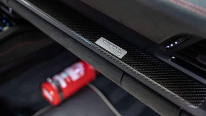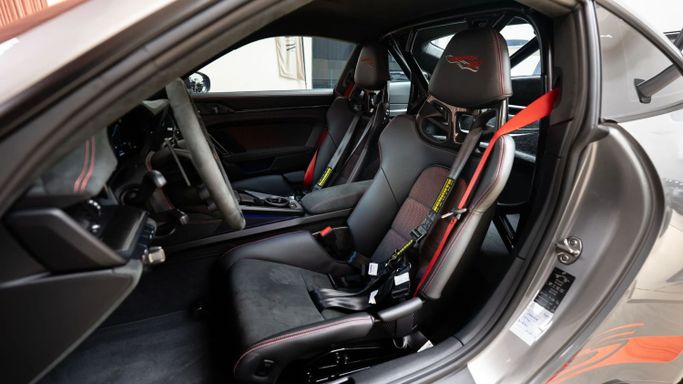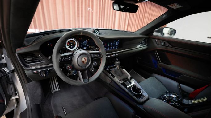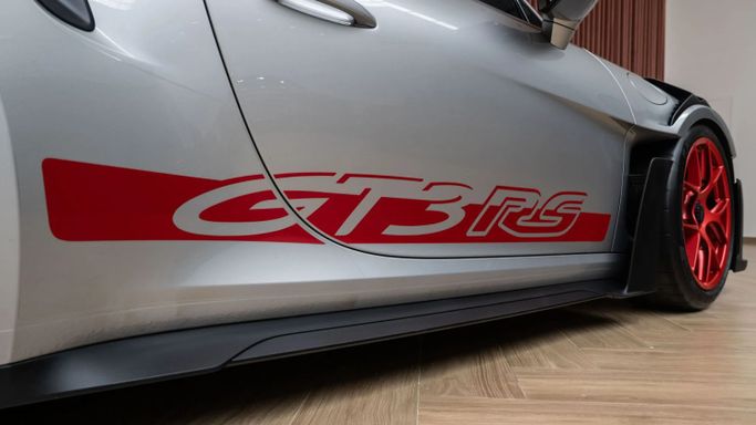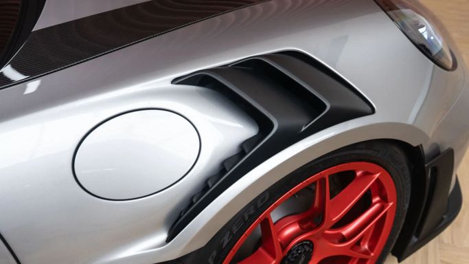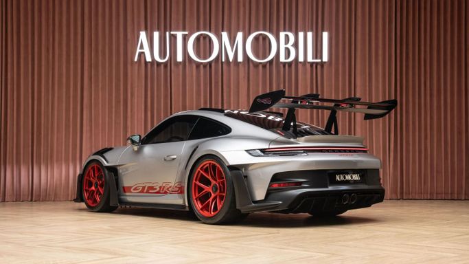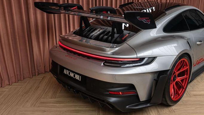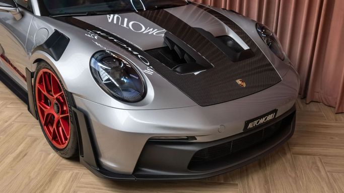 The Porsche 911 GT3 RS (992) with the Weissach Package is the ultimate expression of precision engineering. A road-legal race car that redefines performance. Every element is crafted for function and feel: exposed carbon fibre, aerodynamic wings, and a chassis honed to perfection. Powered by a naturally aspirated 4.0-liter flat-six producing 525 hp, it revs to 9,000 rpm with breathtaking immediacy. This configuration in GT Silver Metallic exterior color with carbon accents and magnesium lightweight wheels painted in pyro red gives it an aggressive, motorsport-inspired elega