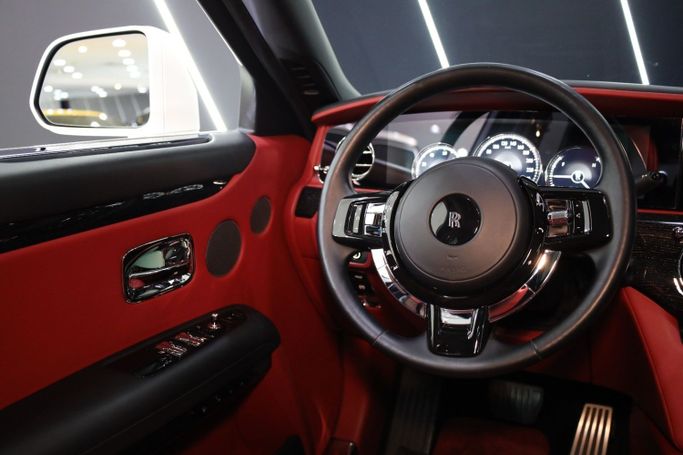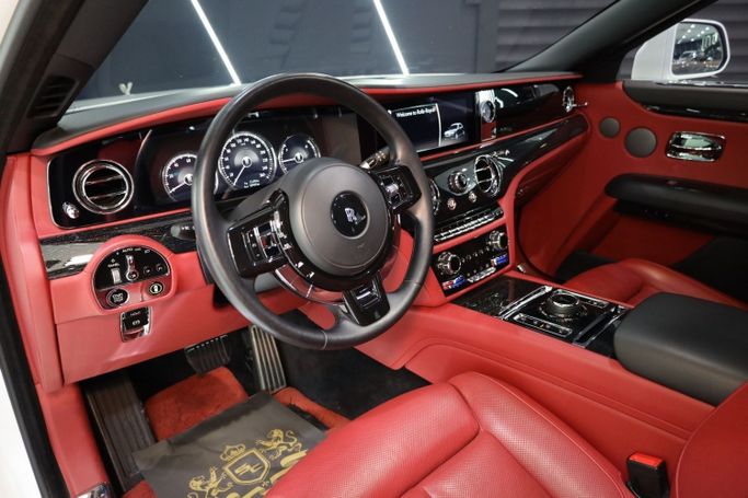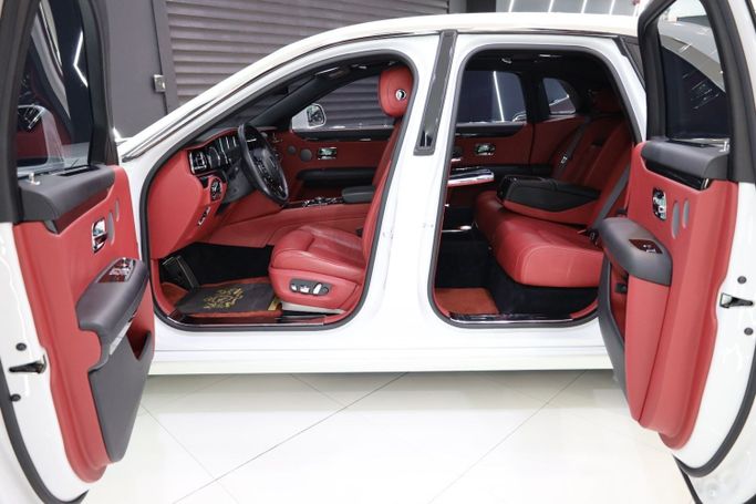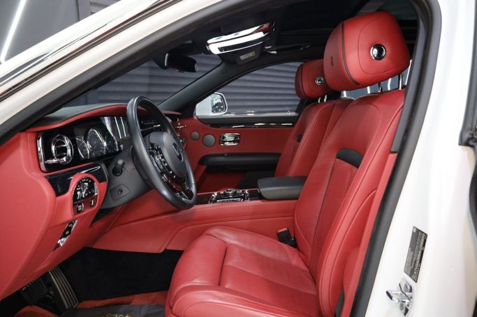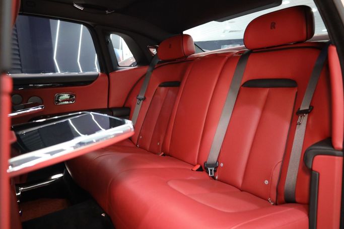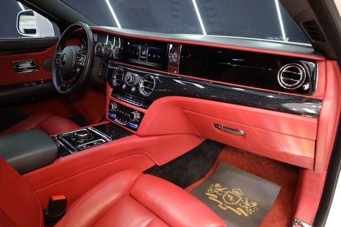 Rolls Royce Ghost GCC Specifications Panoramic Roof Wood Interior Head-Up Display Blind Spot Assist Park Assist Ventilated Seats Heated Steering Wheel Rear-Seat Picnic Tables Ambient Lighting Apple CarPlay Red Coach Line 360° Camera 21-Inch Wheels